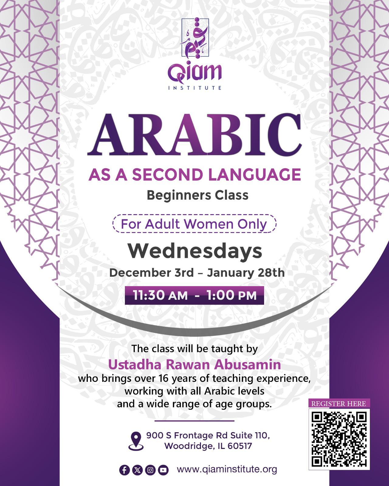 We are excited to announce a Beginner-Level Arabic as a Second Language class for adult women only at Qiam Institute!